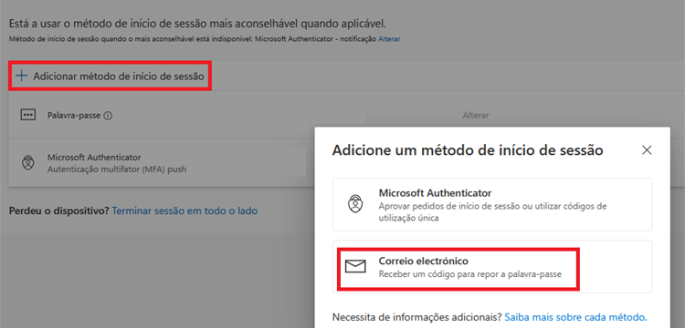 Clique em "Adicionar método de início de sessão".